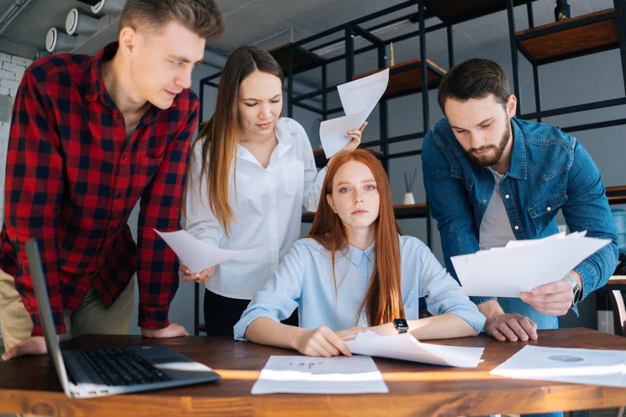 Previous Image Next Image Tired young female team leader under stress at office sitting at desk with multiracial colleagues shaking paper documents standing near her, looking at camera. Source: https://www.istockphoto.com/portfolio/dikushin?mediatype=photography Share this:TweetLike this:Like Loading...